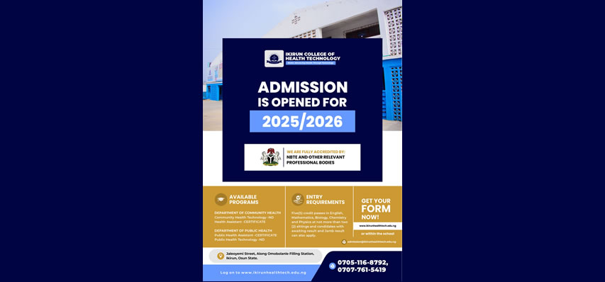 ADMISSION NOTICE: Ikirun College of Health Technology Announces Admission for 2025/2026 Academic Session