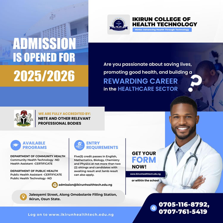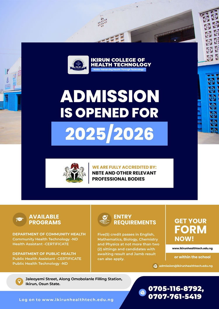 The Management of Ikirun College of Health Technology is pleased to announce that admission is now open for the 2025/2026 academic session. The institution invites suitably qualified candidates to apply for its accredited programs in Community Health Technology and Public Health Technology.